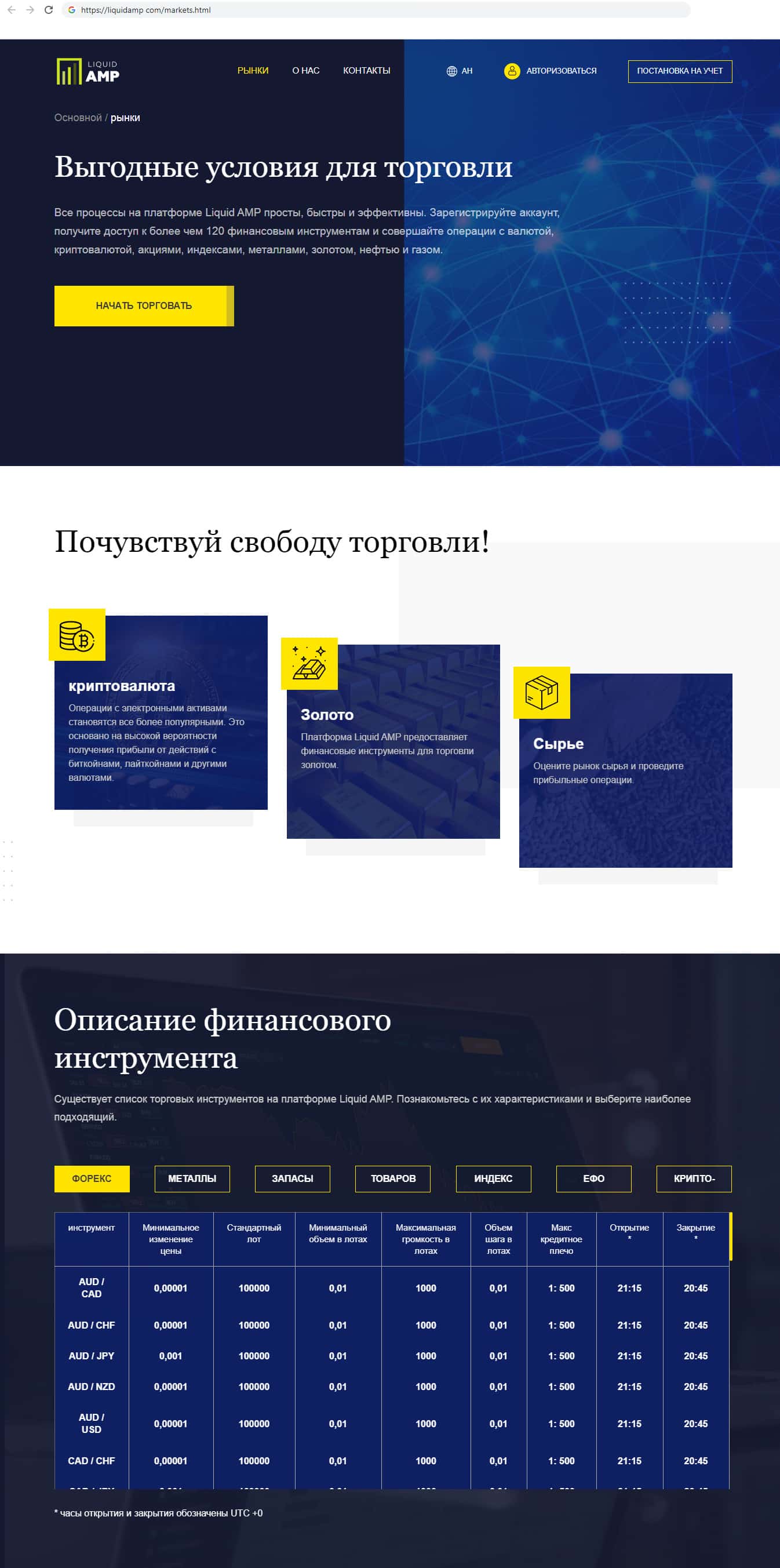 На своём сайте компания махинаторов LiquidAMP продемонстрировала информацию о рынках. Фирма указала, что именно у них самые выгодные условия торговли, а так же продемонстрировала свои инструменты. Жулики наврали в этой информации абсолютно всё, так как у компании с выгодными условиями не может быть такой плохой репутации.