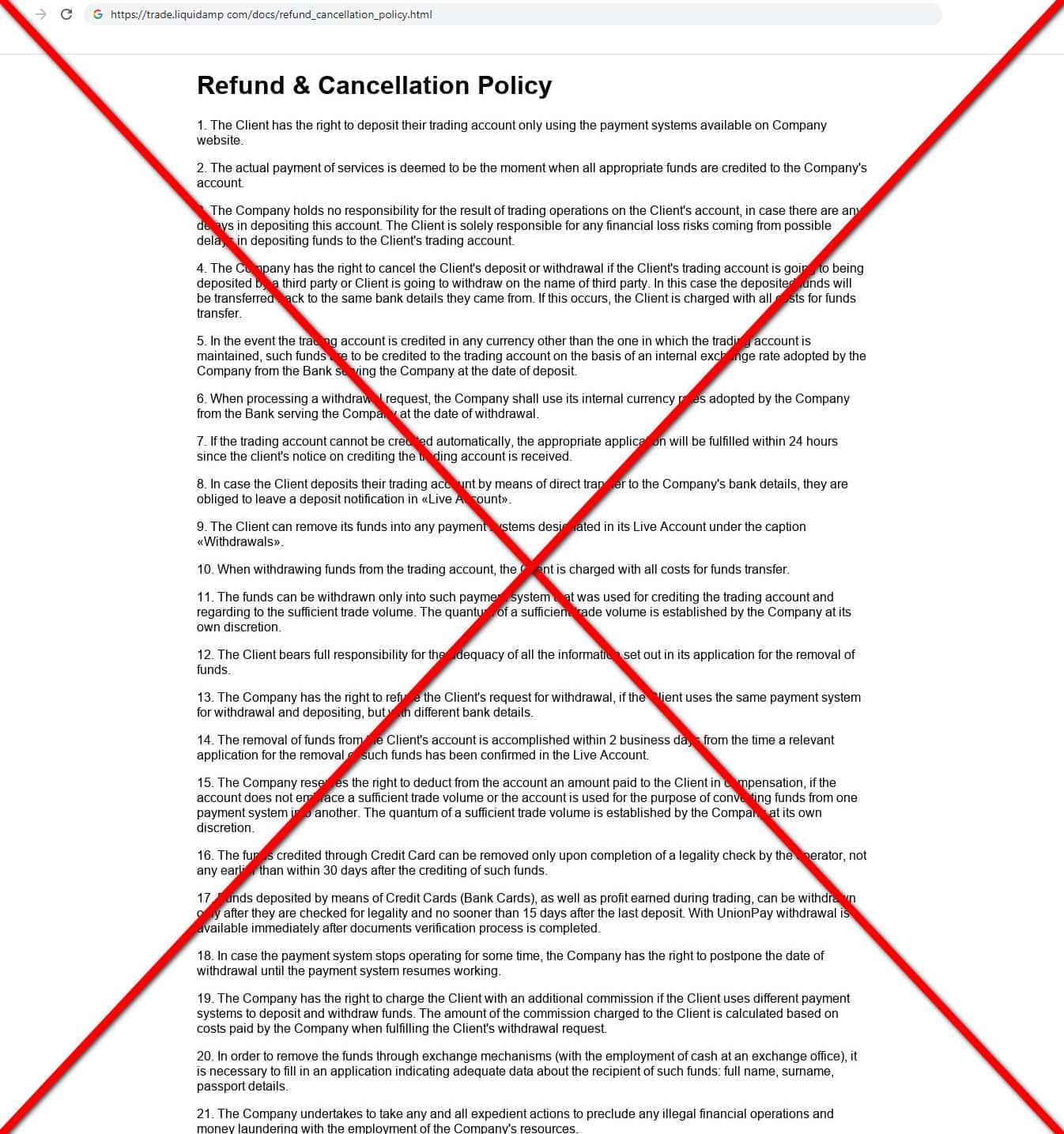 Лохотрон Ликвайд АМП продемонстрировал пользователям политику возврата средств, которая так же представлена на английском языке. Но по сути это фальшивый документ, так как компания никаких средств не возвращает. Мошенники сразу же присваивают деньги себе, о возврате и речи быть не может.