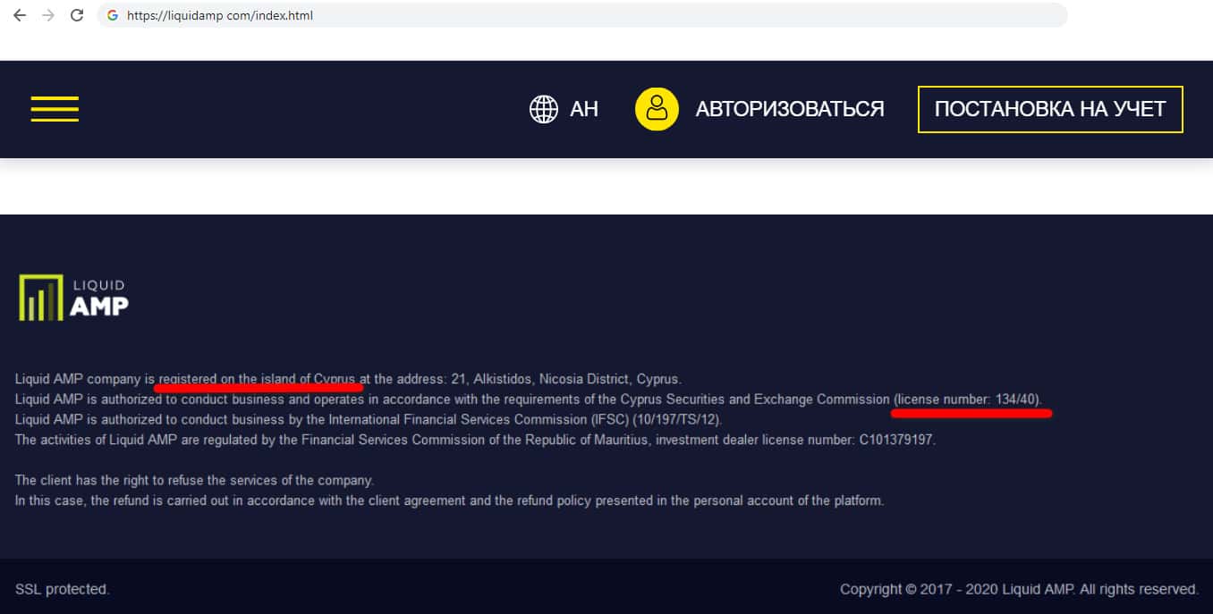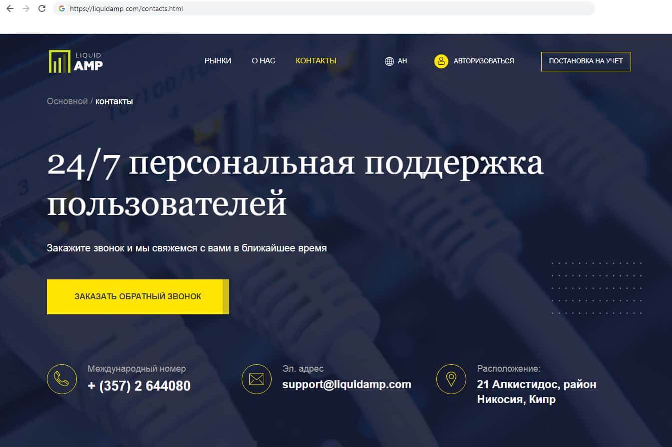 Компания финансовых разводил LiquidAMP указала, что зарегистрирована на Кипре, что является оффшорной зоной и излюбленным местом регистрации фальшивых брокерских компаний. Фирме там очень легко зарегистрироваться и тем более руководство компании может быть скрыто Кипрским законодательством.