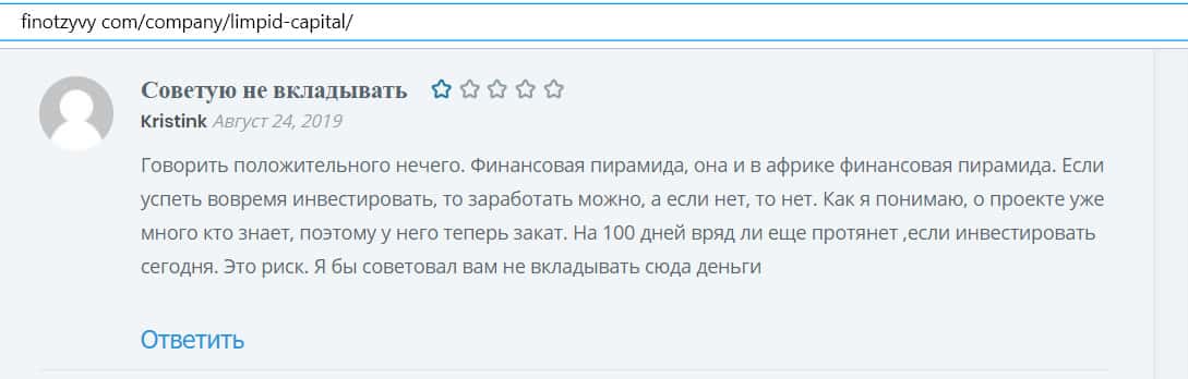 Пользователь оставил предупреждающее сообщение на сайте Финотызвы о лохотроне Лимпид Капитал. По его мнению, это определенно финансовая пирамида, от которой нужно бежать. Ресурс долго не протянет, владельцы собрали уже достаточно денег с клиентов и скоро свернут его, оставив всех остальных в убытках.
