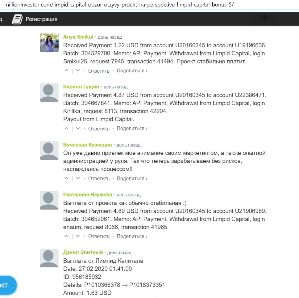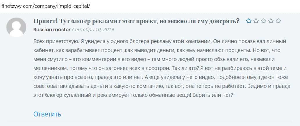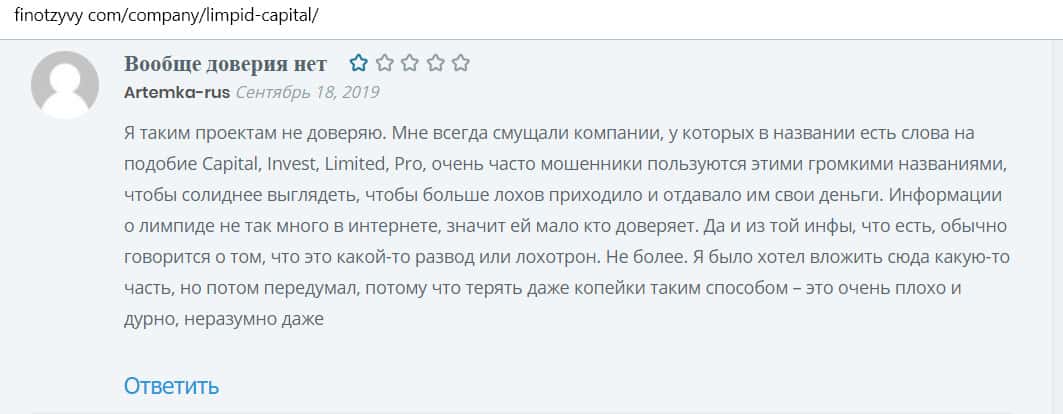 Молодой человек написал, что он не доверяет проекту Лимпид Капитал, так как уже из названия понятно, что это очередной лохотрон. Мошенники часто используют подобные слова, типа: Капитал, Инвест, Лимитед и т.п., в расчете на дурачков. Да и просто, почитав описание ее деятельности, становится ясно, что контора жульническая.