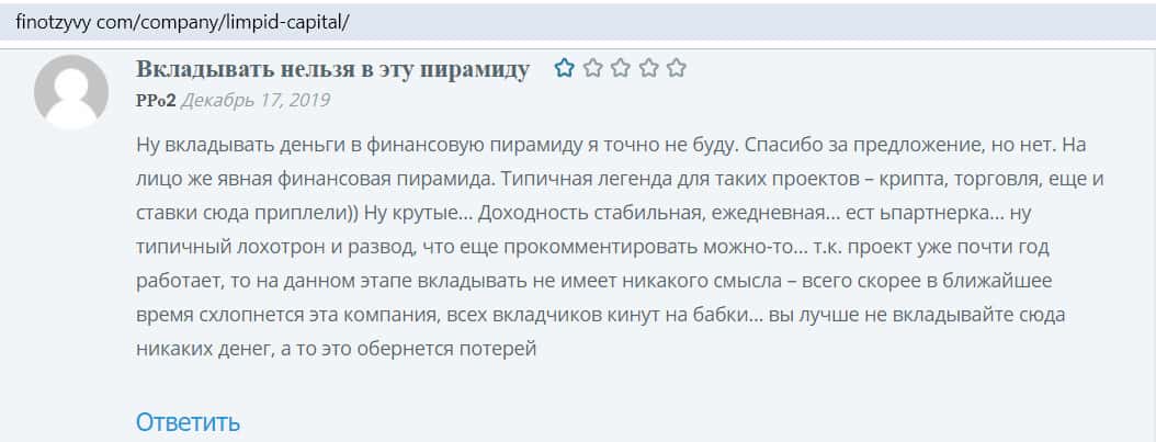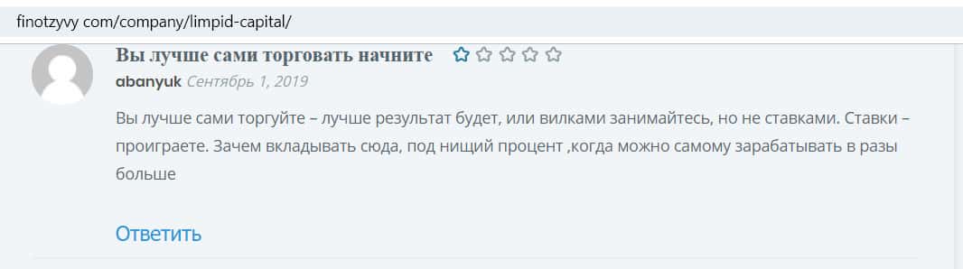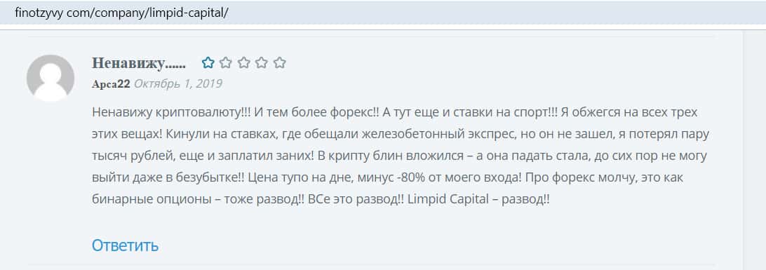 - Комментарий пользователя на сайте Финотзывы: обжегся на криптовалюте и ставках на спорт, Limpid Capital – развод!!