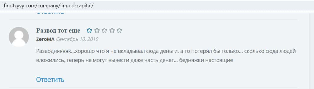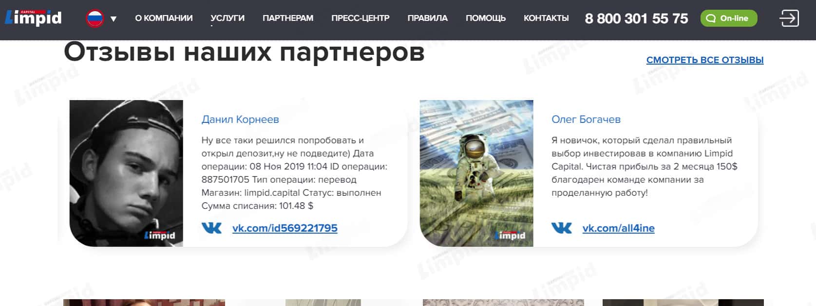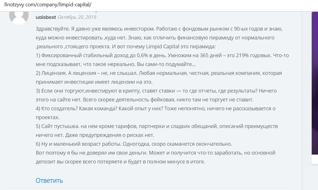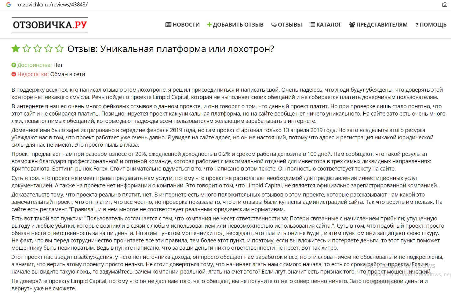 - Отзыв на сайте otzovichka ru: проект Limpid Capital является фейковым, чему есть очень много доказательств
