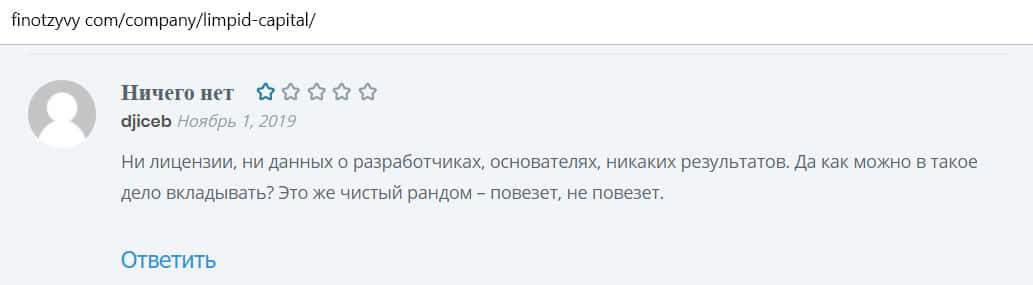 Многие пользователи видят, что о разработчиках проекта нет никакой информации, и понимают, что связываться с Лимпид Капитал не стоит. Очередной отзыв об этой мошеннической компании гласит, что шарага - чистый рандом, лио повезло, либо нет. Разумный человек свои деньги сюда не понесет.