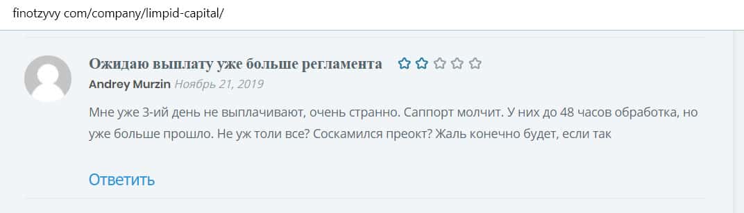 Мужчина написал на сайт Финотзывы, что сайт Лимпид Капитал уже не платит деньги клиентам, это знак скорого закрытия. Его друг, который сначала звал вступить в этот проект, уже не может вывести деньги. Поддержка отмазывается техническими проблемами, но всем ясно, что людей просто обворовывают.