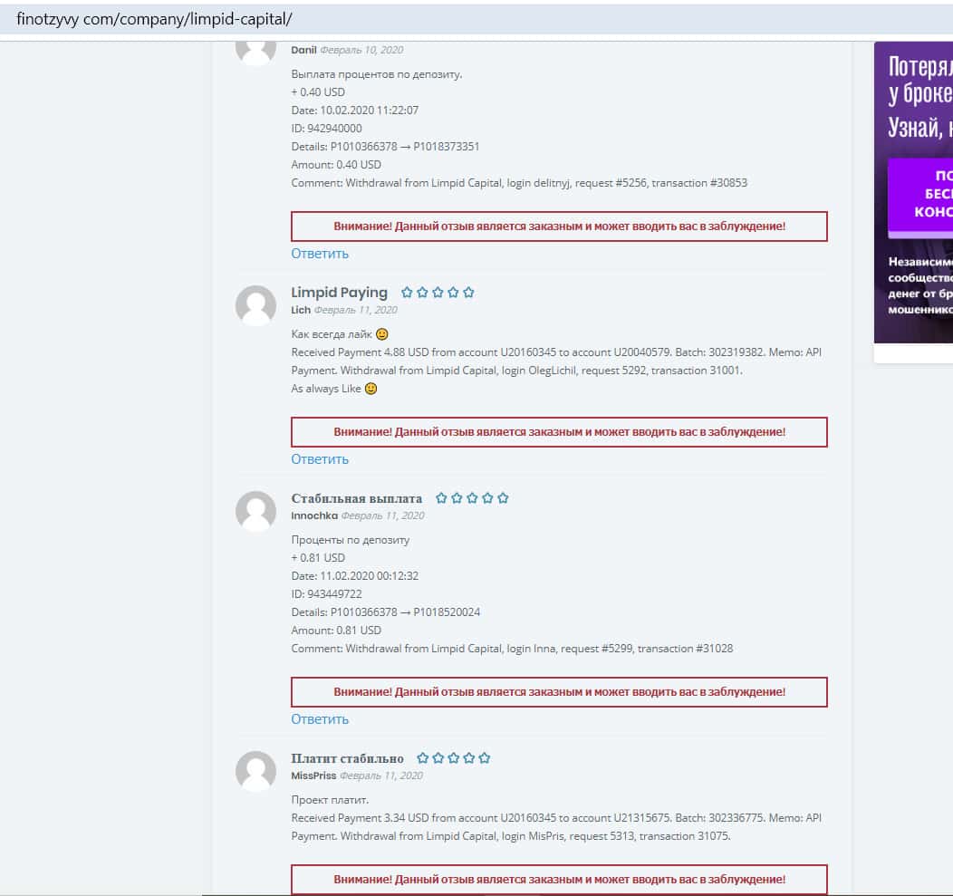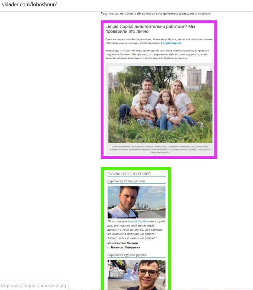 - Множество фейковых отзывов в сети, расхваливающих шарагу Limpid Capital подтверждают, что это лохотрон