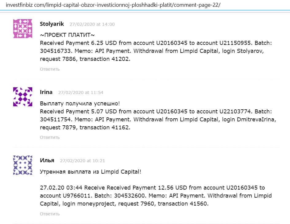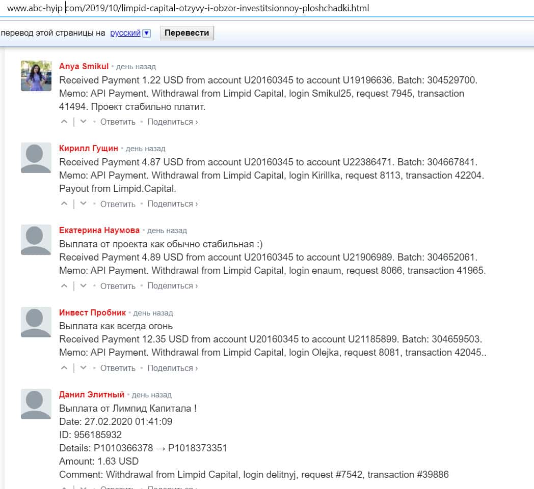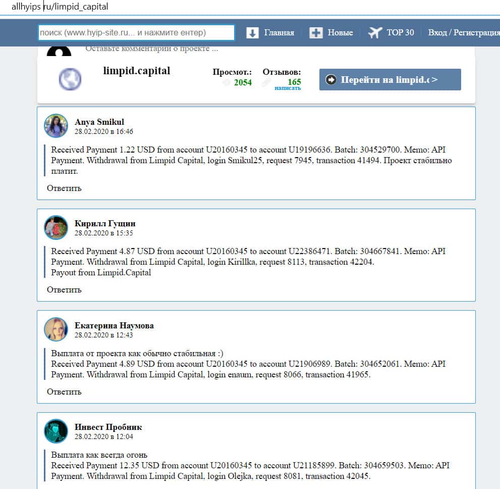 Также, сайты Миллионинвестор, Оллхайп и АВС-хайп опубликовали у себя на страницах абсолютно одинаковые отзывы, видимо отправленные им создателями псевдобиржи Limpid Capital. Отзывы от пользователей Анна Смикул, Екатерина Наумова, Кирилл Гущин говорят о том, что компания выплачивает им деньги.