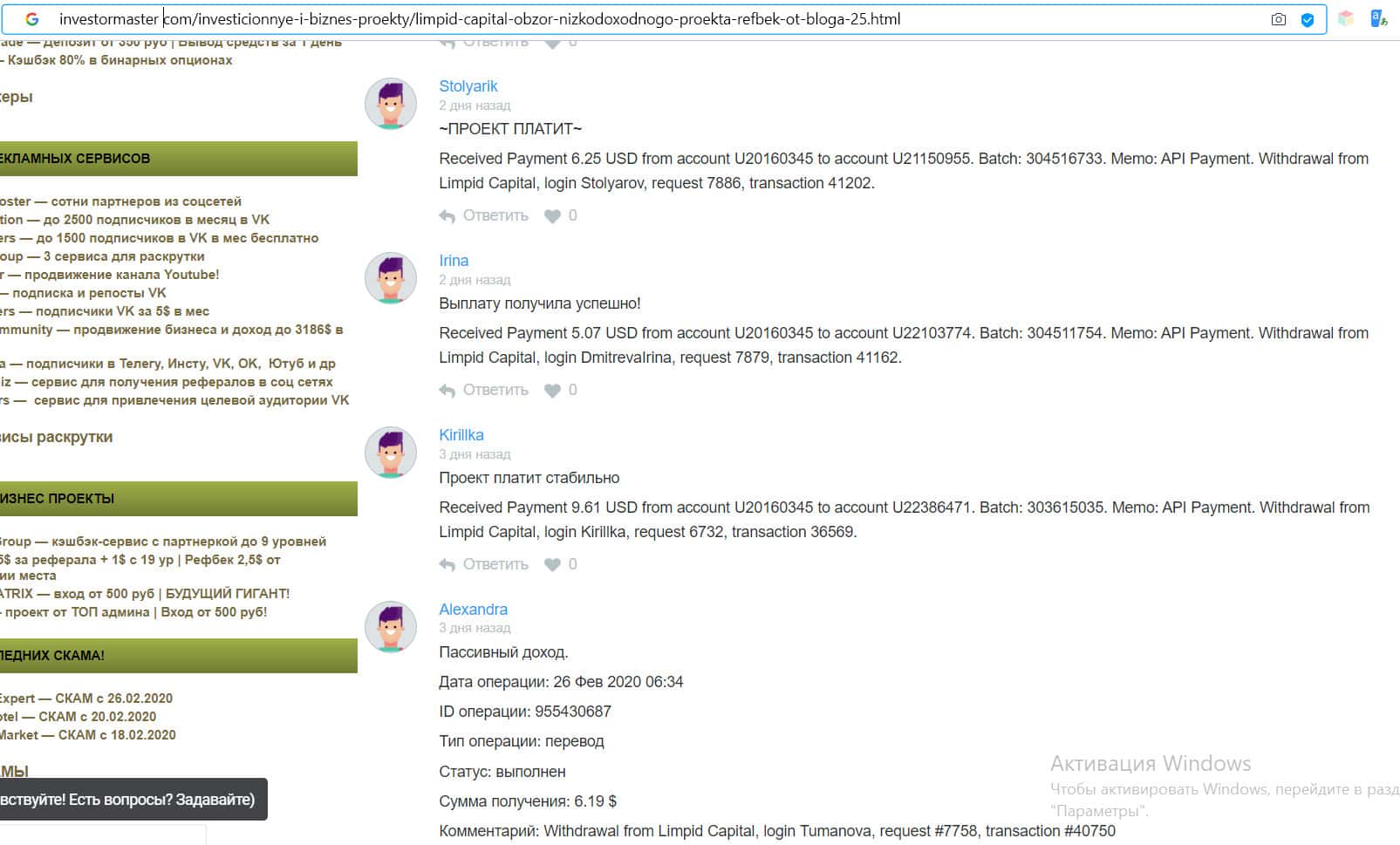 Ирина Перкова справедливо рассудила, что проект Лимпид Капитал является скамом, поэтому он скоро закроется. Возможно, поначалу мошенники и платили первым и нвестроам, чтобы привлечь внимание, но сейчас люди, получившие выплаты, ушли, и у Лимпид Капитал тупо нет денег, чтобы платить другим.