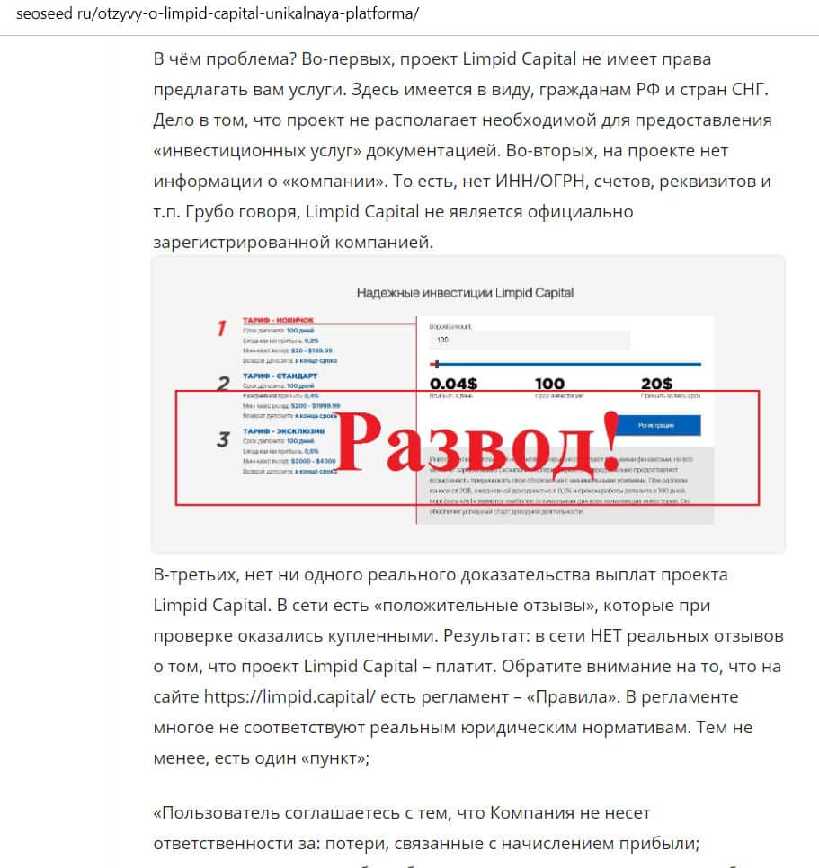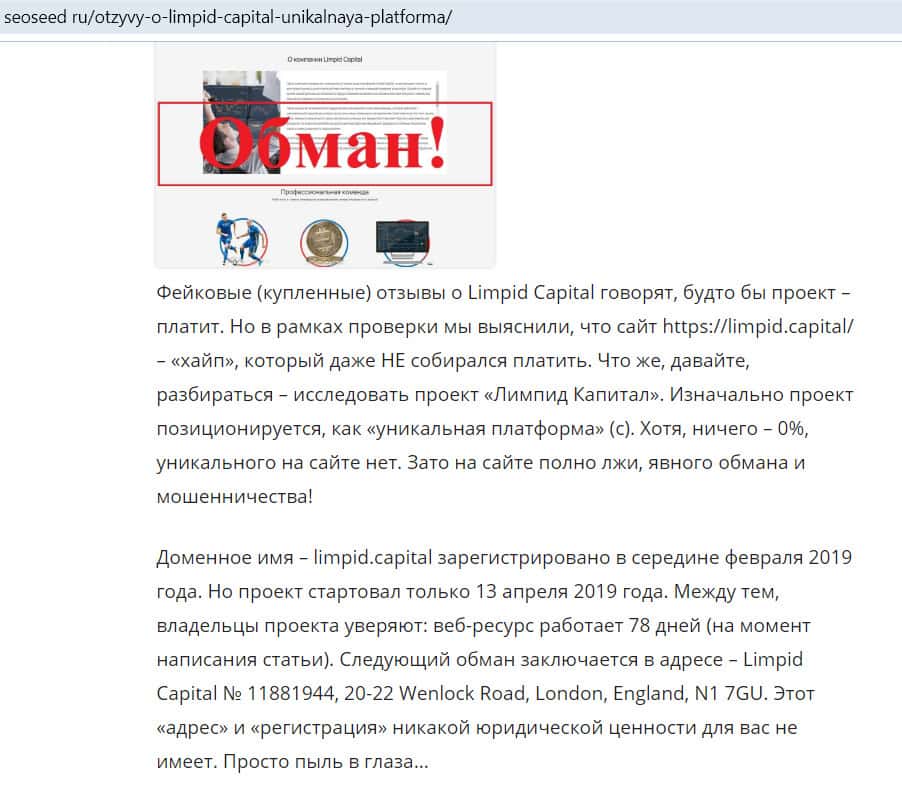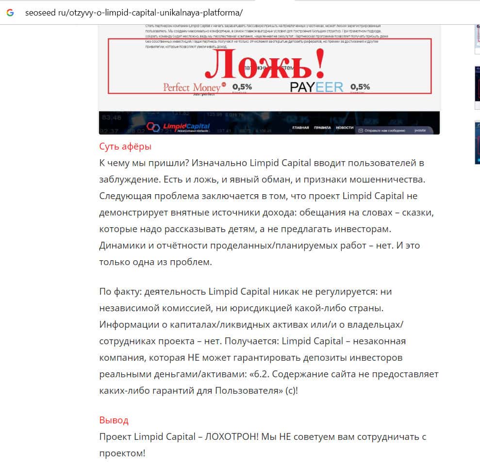 Сайт seoseed ru написал разоблачающую статью о мошенниках из Limpid Capital