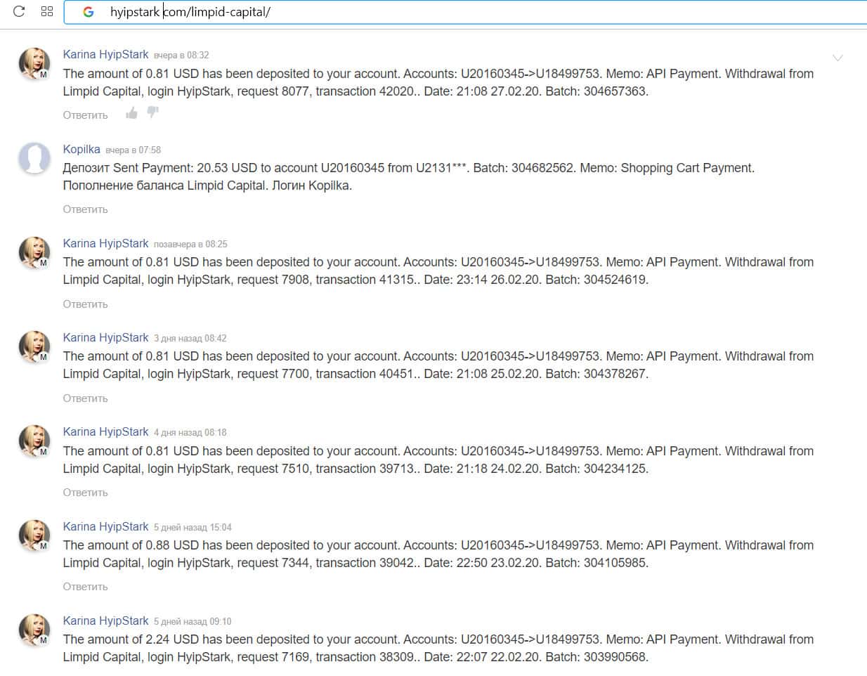Сайт Хайпстарк и вовсе удивил своей несообразительостью. Туда писала одна и та же девушка, каждый день, и оставляла одинаковые сообщения о том, что ресурс Limpid Capital выплачивает ей прибыль. Девушку зовут Карина Хайпстарк (!). Такой неумелый фейк, что просто стыдно за его автора.