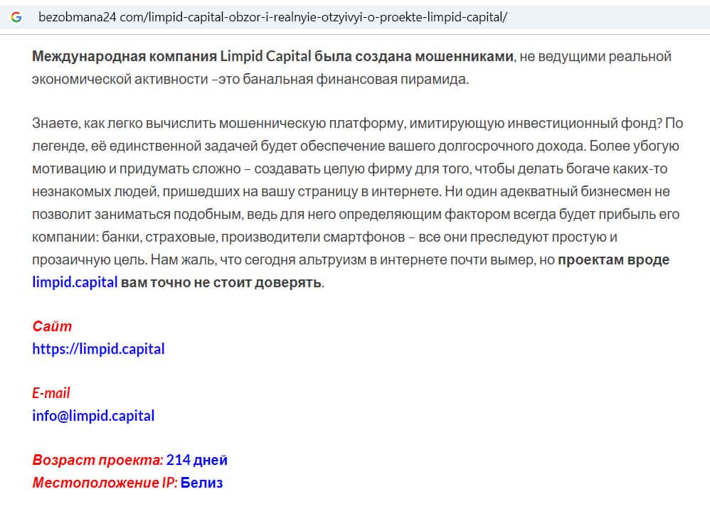 Мнение сайта bezobmana24 com: компания Limpid Capital создана мошенниками для собственного обогащения