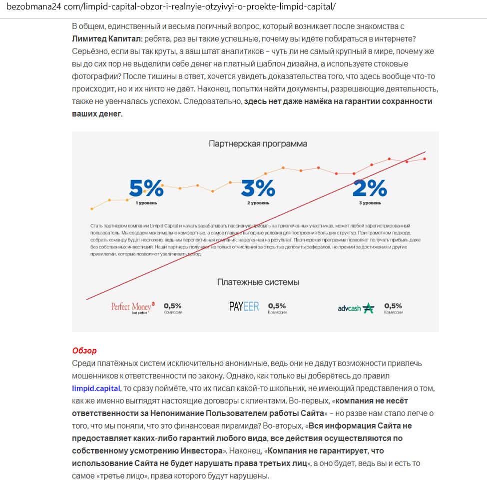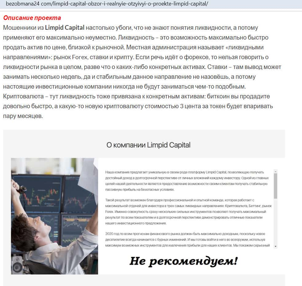 Безобмана24 пишет о том, что сайт Limpid Capital просто переполнен лживой информацией, с дешевыми картинками, а тексты написаны чуть ли не школьниками. Правила использования изложены убогим языком, после их прочтения складывается впечатление, что владельцы фирмы ни разу не видели нормальный договор.