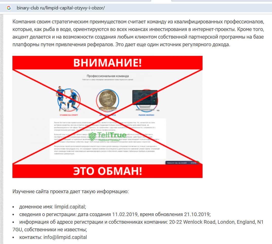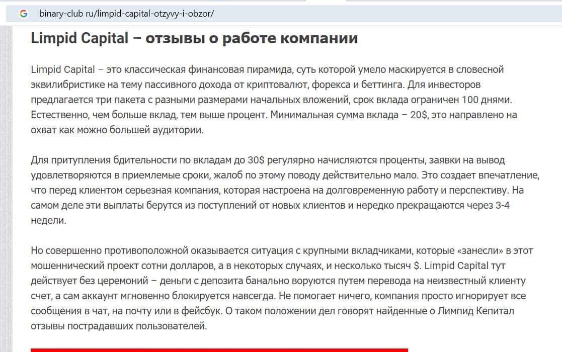 - Ресурс binary-club ru о компании Лимпид Капитал: обходите эту пирамиду как можно дальше