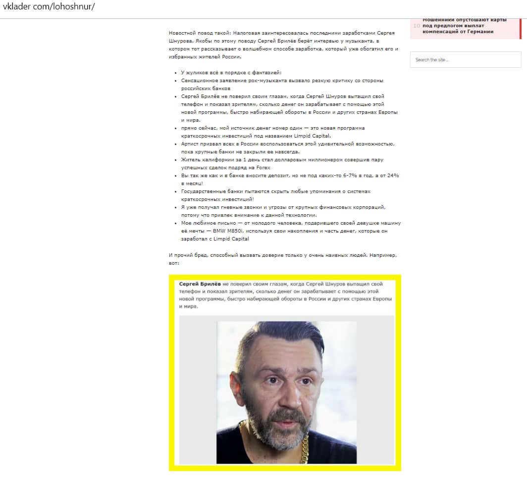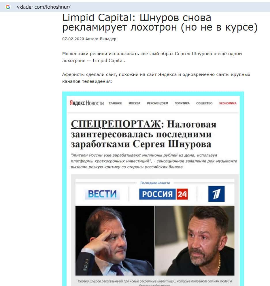 На сайте Вкладер появилась статья о том, что известный певец Сергей Шнуров рекламирует жуликов из Лимпид Капитал, но он не в курсе этого. Мошенники создали сайт-клон, визуально похожий на сайты первых каналов ТВ. Там Шнуров якобы дает интервью, где рассказывает о суперзаработках с Лимпид Капитал.