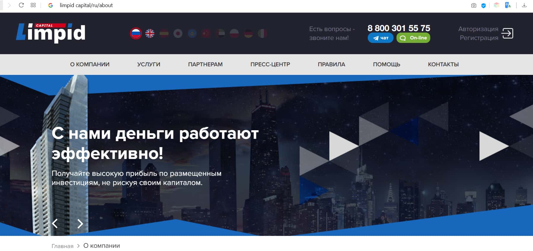 Жулики из Limpid Capital состряпали свой сайтик подобно другим лохотронам: те же банеры с красивыми картинками, призывные лозунги. Сайт якобы переведен на 10 языков, но на самом деле он полностью написан на русском. Слова о том, что это международная компания - полная ложь для дурачков.