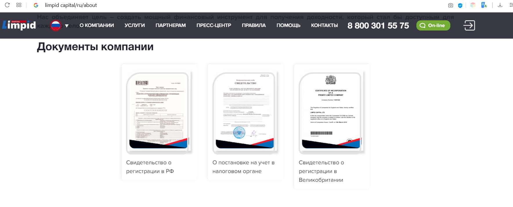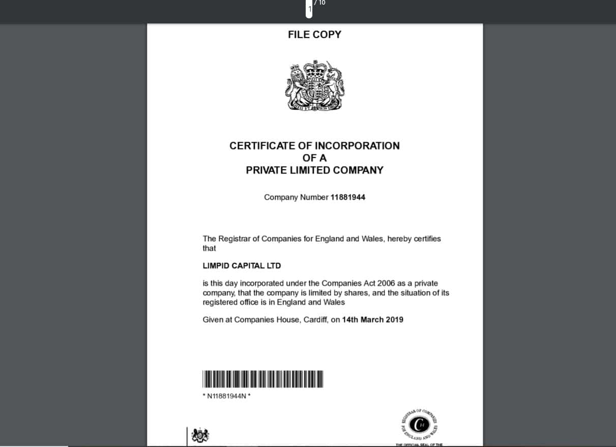 Никакой лицензии у мошенников из Лимпид Капитал естественно, нет, потому что ее им никто не выдавал. На сайте размещены поддельные документы, что контора зарегистрирована в Великобритании, но даже дуракам понятно, что это фейк. Там даже нет печати, а сам документ, скорее всего, скачан с интернета.