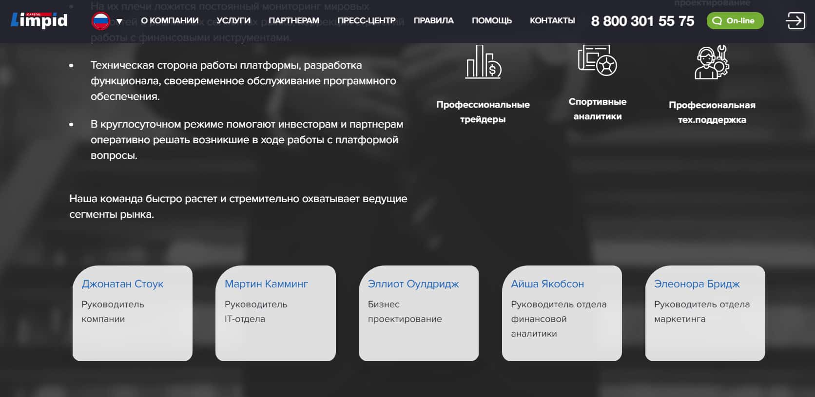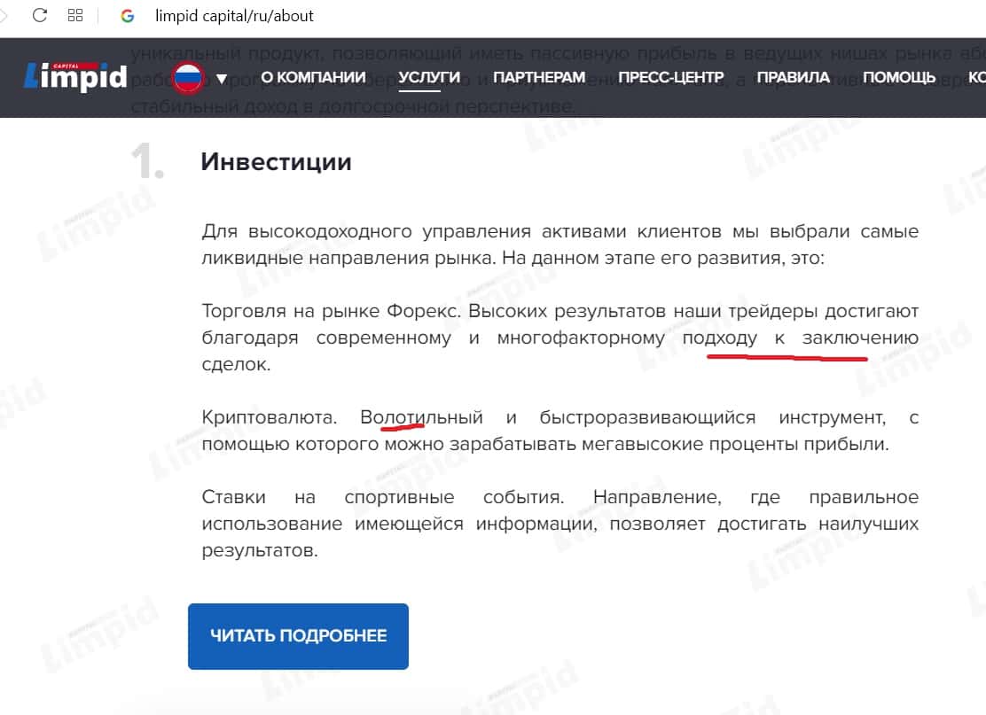 И заканчивает главную страницу сайта привычное вранье о том, что компания Лимпид Капитал стремится к улучшению благосостояния всего народа и прочая чушь. Мошенники называют ликвидными такие опасные направления, как ставки на спорт и торговлю криптовалютой, что полнейшая ерунда.
