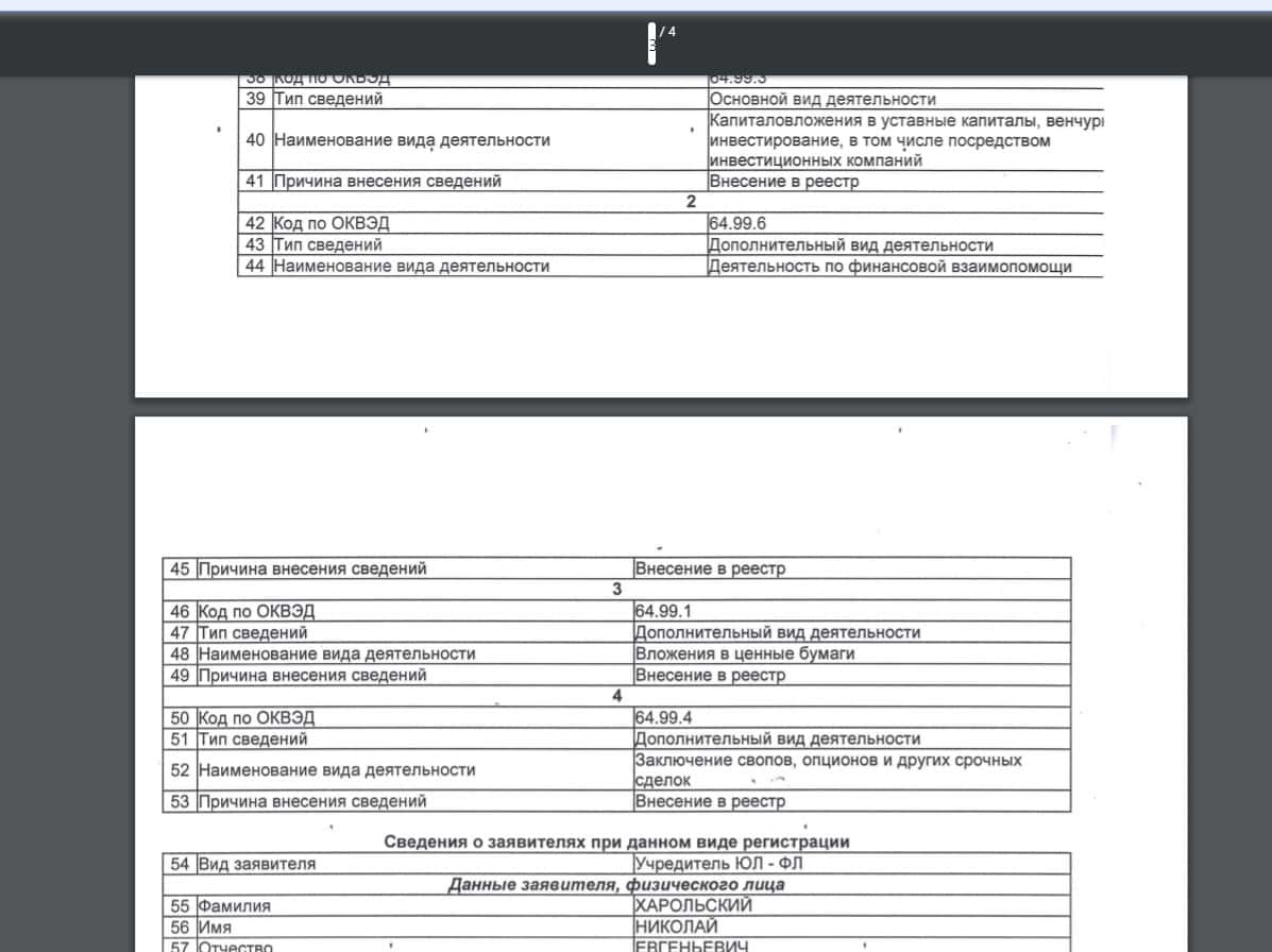 На самом же деле лохотрон явно российский, это видно по всему, а иностранцев приплели для придания веса - компания же будто бы международная. Однако, если заглянуть в документ ЕГРЮЛ, выложенный на сайт Лимпид Капитал, мы видим, что шарага зарегистрирована на имя Харольского Николая Евгеньевича.