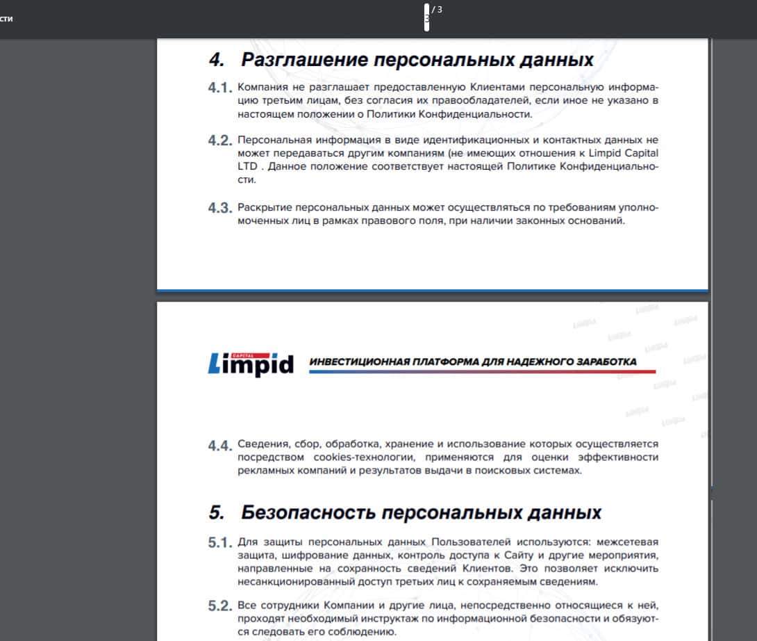 Политика конфиденциальности скам проекта Лимпид Капитал