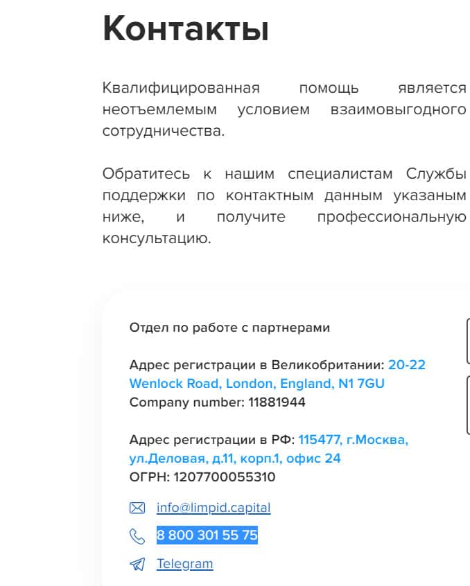 Связаться с организаторами лохотрона Limpid Capital скорее всего, никак не получиться. Адрес в Великобритании ненастоящий, а в Москве, возможно сидит какой-нибудь оператор, отвечающий по многоканальному телефону: 8 800 301 55 75. Но это не точно.