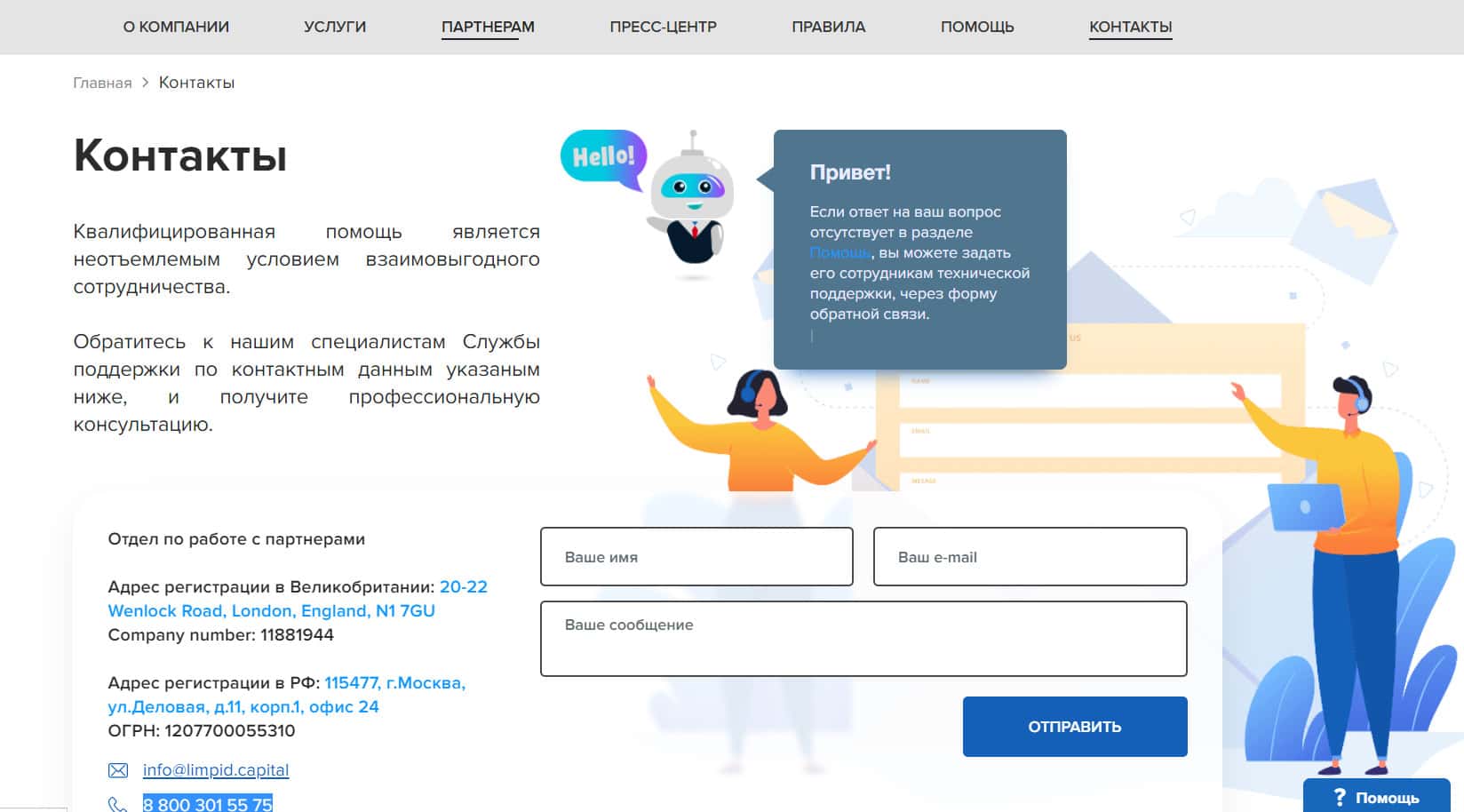 Также в разделе Контакты есть форма обратной связи и имитация живого чата с техподдержкой под названием Помощь. Там отвечает бот, а не живой человек. По всей видимости, связаться с живыми сотрудниками компании Лимпид Капитал вообще невозможно.