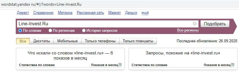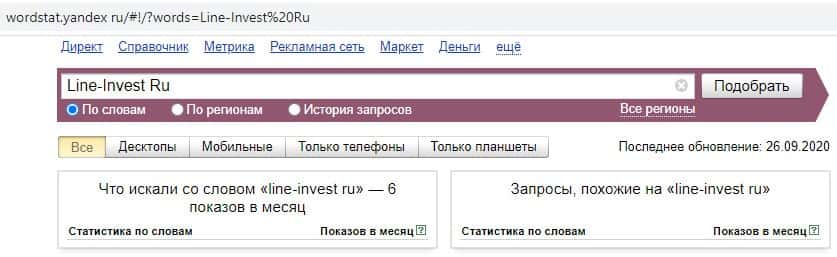 Начинаем с запросов на английском языке. Первый запрос в Яндекс на английском языке с одним пробелом и без точки "Line-Invest Ru" выдает результат в 6 показов в месяц.