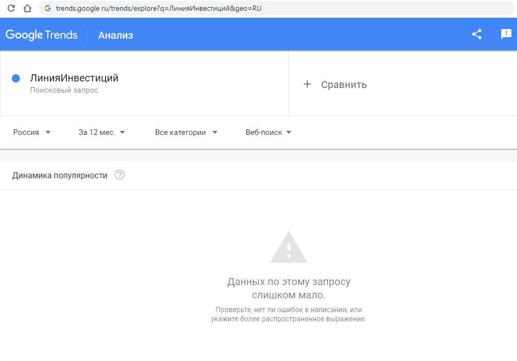 Последний запрос в Гугл на русском языке без пробела "ЛинияИнвестиций" выдает результат, как и в прошлый раз - 0 показов в месяц. По такому запросу информацию не ищут.
