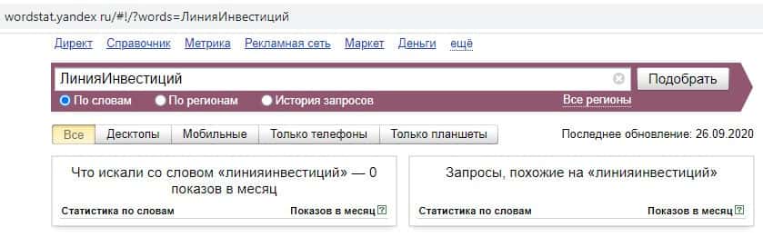 И последний запрос на русском языке в яндексе "ЛинияИнвестиций" выдает уже результат в 0 показов в месяц. Так информацию о мошенниках в сети никто не ищет.