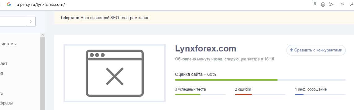 Судя по информации, которая содержится на уважаемом веб-портале a pr-cy ru, оценка сайта составляет 60 процентов, но более точных сведений собрать невозможно, что само собой вызывает некие подозрения. Мы видим демонстрацию еще одного доказательства реального слива шулерского форекс брокера Lynx Forex с просторов сети интернет.