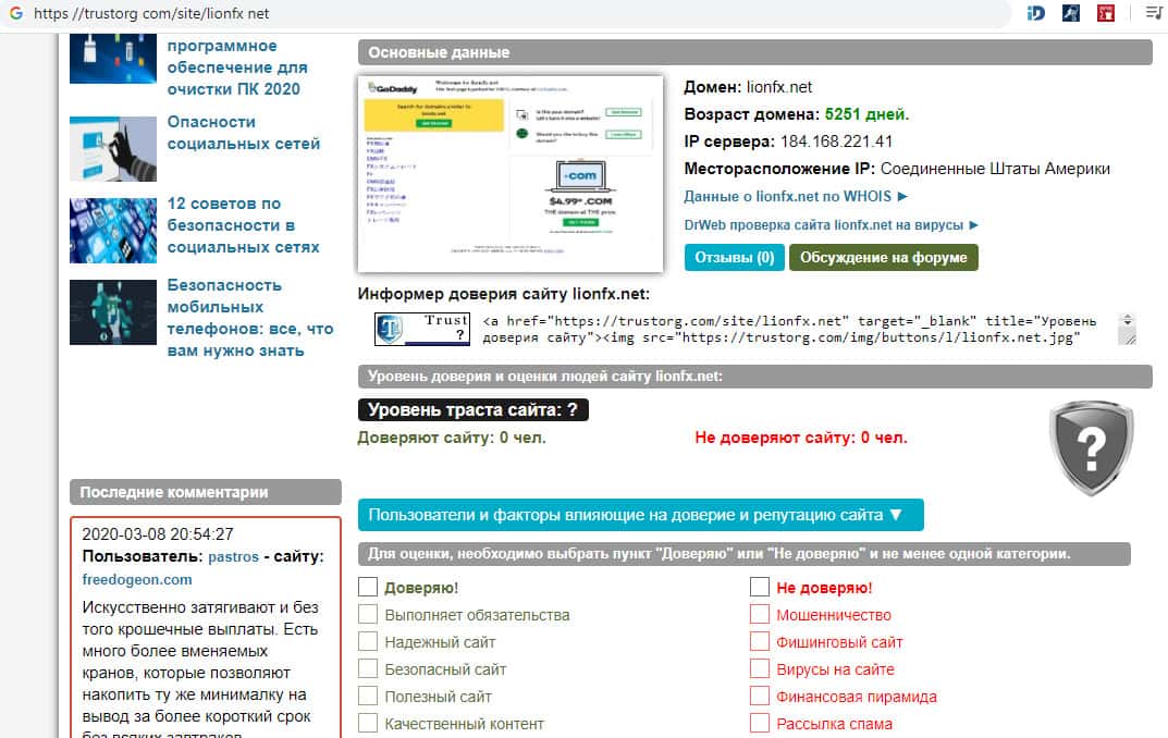Согласно сведениям с компетентного интернет-портала trustorg com у проверяемого веб-сайта слившегося форекс брокера Лион Фх нет оценок и комментариев в их системе. В общем, домен существует 5251 день и располагается в США, но более точных данных в сети интернет нет вообще. Аферюги по-тихому смылись с чужими денежками своих клиентов.