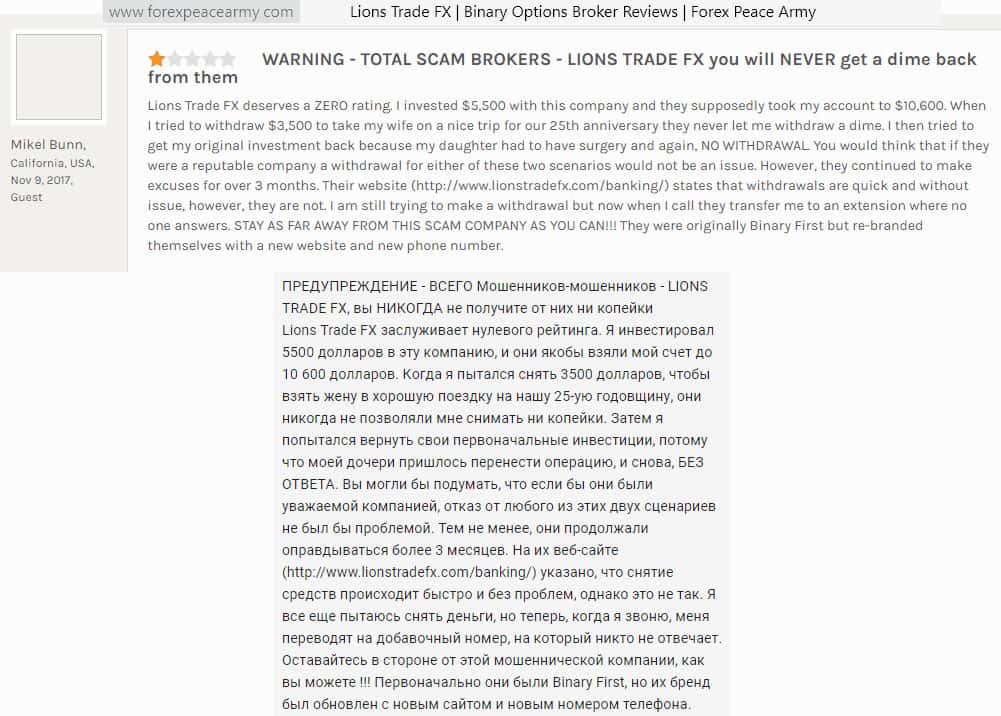 Реальный отзыв о работе мошеннической организации Lions Trade FX оставил также пользователь того же самого сайта под названием forexpeacearmy com. Пользователь в подробностях рассказал о том, как выглядит процесс облапошивания людей в Лионс Трейд ФХ, которая являлась международной мошеннической конторой.