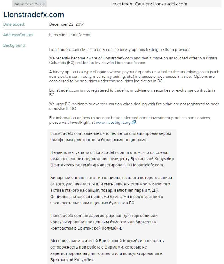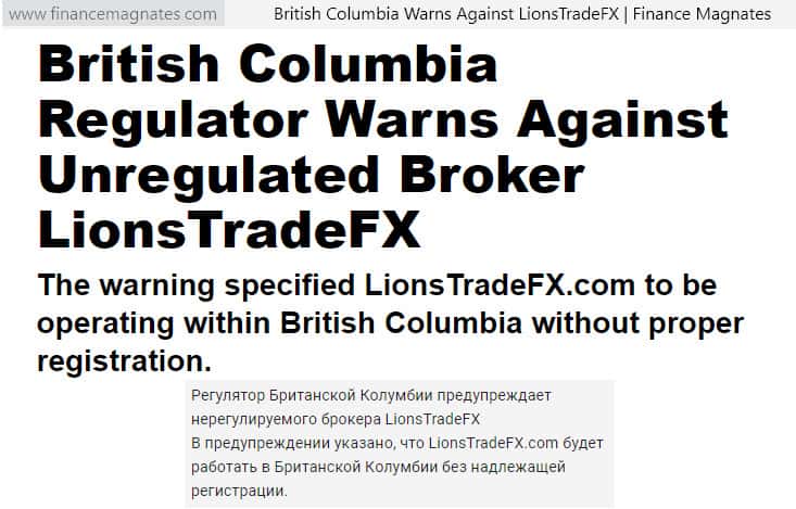 Ниже мы можем видеть само заявление на сайте официального регулятора Британской колумбии BCSC. Здесь говорится ровно то же, о чём было сказано в статье на вышеуказанном новостном портале – Lions Trade FX является фейковым брокером, не имеющим лицензии на осуществление финансовой деятельности. Это и является самым ярким признаком аферистов.