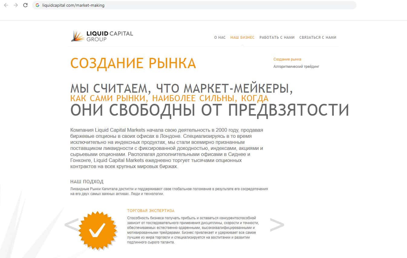На своём сайте разводилы Ликвайд Капиал Групп презентовали пользователям пункт под названием "Создание рынка". Кроме как хвастовства о том, что их компания работает более 20 лет, ничего нет. Но нет доказательств того, что фирма действительно столько работает, сайт действительно создан давно, но о работе компании нет никакой информации.