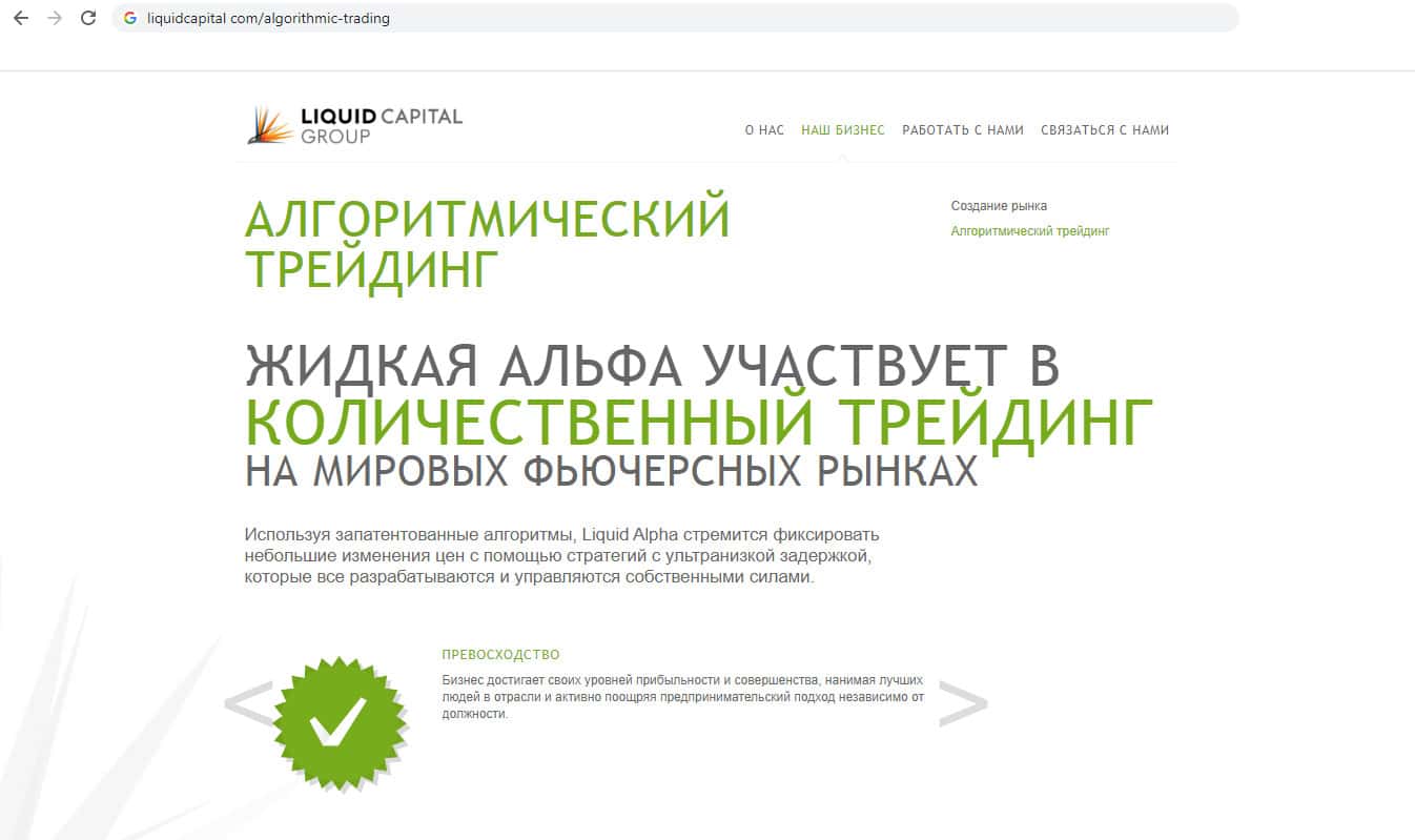 Лохотронщики Liquid Capital так же добавили на свой сайт раздел "Алгоритмический трейдинг". В нём компания рассказывает, что использует кем то запатентованные алгоритмы, хотя доказательств этому никаких нет. И именно их команда "профессионалов" знает как торговать и как зарабатывать деньги, что весьма и весьма сомнительно.