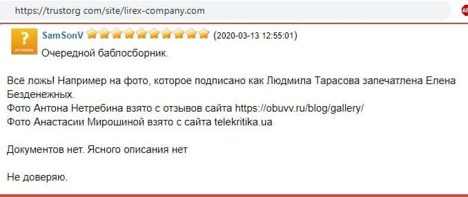 Внимательный трейдер в своем отзыве на веб-ресурсе trustorg com отмечает, что на официальном сайте инвестиционной компании Lirex-Company Com нет никакой достоверной информации, даже личности администраторов проекта фейковые, и взяты с других интернет-источников. Таким проектам доверять нельзя, если Вам дороги Ваши деньги.