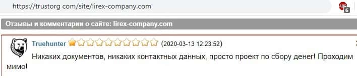 Эксперты интернет-ресурса guardofword com в своем аналитическом обзоре о деятельности инвестиционной компании Lirex-Company утверждают, что эта контора – откровенный мошеннический мусор, дешевый сайт, на котором нет внятного описания, отсутствует какая-нибудь юридическая информация, нет сертификата. Связываться с этим проектом ни в коем случае не стоит.