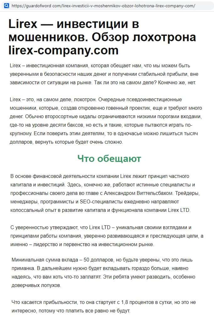 - Инвестиционная компания Lirex-Company - полностью лживый проект, созданный для обмана и сбора денег