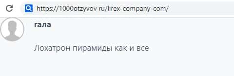 Обманутый трейдер в своем коротком отзыве, оставленном на странице информационно-аналитического ресурса 1000otzyvov ru, делится мнением что мошеннический проект Lirex-Company Com построен по принципу финансовой пирамиды, и по существу является обыкновенным лохотроном.
