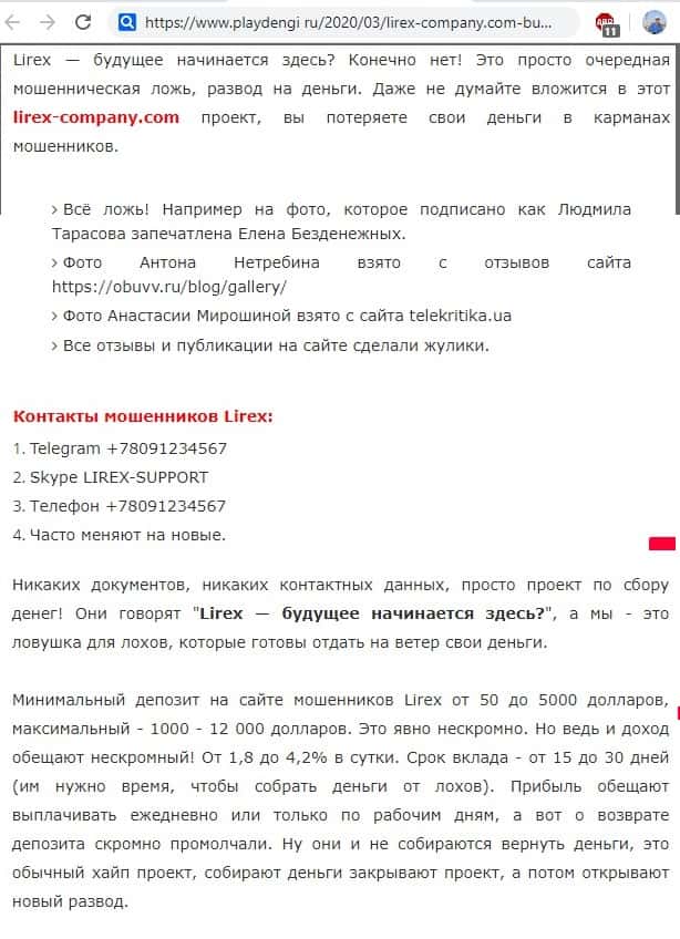 Эксперты с информационного портала playdengi ru рассказали в своем обзоре о том, что вся информация, размещенная на официальном сайте компании Lirex-Company Com, откровенно лживая и недостоверная: фотографии и личности администраторов - липовые и взяты с открытых интернет-источников, контактные данные постоянно меняются, все отзывы, опубликованные на сайте сделаны по заказу мошенников.