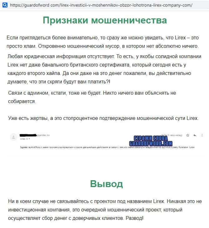 - По мнению авторов аналитического обзора с веб-сайта guardofword com компания Лирекс - МОШЕННИКИ