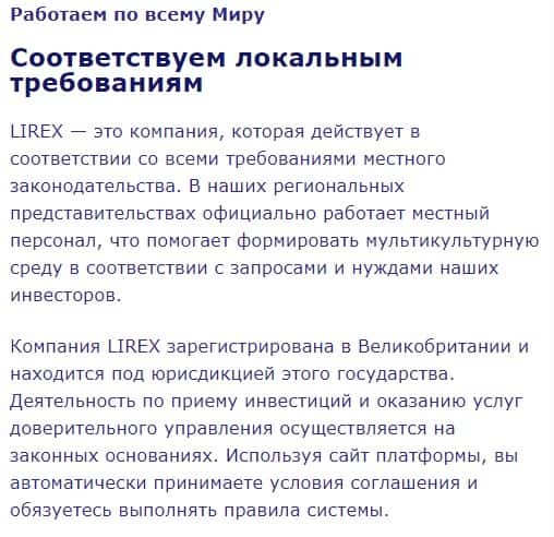Если верить информации, размещенной на официальном сайте инвестиционной мошеннической компании Lirex-Company Com, то она зарегистрирована и находится под юрисдикцией Великобритании, а осуществляет деятельность по всему миру.