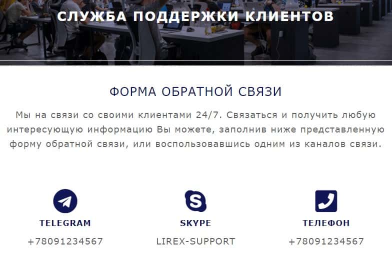 Контактная информация инвестиционной компании Lirex-Company Com, размещенная на ее официальном сайте, весьма скудная, нет ни юридического адреса, ни адреса электронной почты, только телефон, номер в Телеграмме и логин в Скайпе: