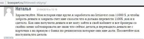 Девушка и сама не поняла как стала жертвой развода брокерской конторы Литт Инвест. Она повелась на уговоры звонаря, который сообщил ей что есть отличное предложение по инвестированию и постепенно вытянул из нее 3280 долларов. Теперь нужно как то их вернуть обратно, но после запроса на вывод ей заблокировали счет и он не может это сделать, поэтому и просит помощи на разных форумах.