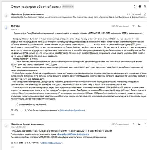 Еще один человек подозревает, что шарлатаны конторы LittInvest кинули его на сумму в размере 2700 долларов. Деньги аферисты выманили под гарантии сохранности и приумножения средств, а когда клиент все перевел, что на телефон перестали отвечать аналитики, которые были ответственны за счет. Жена посоветовала написать в службу ChargeBack.Me где знают как выйти из этого положения.