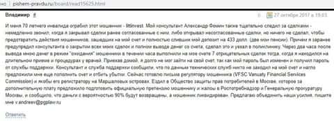 Разводы мошенников не знают границ, контора LittInvest настолько обнаглела, что уже добралась до пенсионеров-инвалидов. С 70-летним стариком работал аферист-консультант Александр Фомин, который следил за сделками и иногда проводил финансовые операции без уведомления хозяина счета. И вот был момент, когда клиент захотел вывести деньги и создал заявку, а сам уехал в поликлинику и сообщил своему консультанту. Когда дедушка приехал, он увидел, что было совершенно 7 отрицательных сделок и депозит болтался около нуля. Он долго не мог зайти на свой счет, потому что мошенник поменял пароль. Но тех поддержка решила этот вопрос с заявлениями, что на счет никто не заходил и просили вкинуть еще хоть что-нибудь на счет. Теперь он предлагает объединиться и написать жалобы в Роспотребнадзор, Генеральную прокуратуру и в липовый регулятор VFSC.