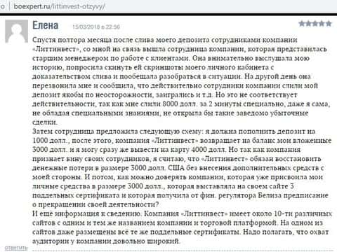 Брокерская кухня LittInvest однажды заигралась с деньгами своего клиента и слила 8000 долларов за 2 минуты. Но даже после этого инцидента у них хватило совести позвонить. Жертве обмана позвонила девушка и сказала, что сотрудники, которые это сделали наказаны и она готова помочь восстановить счет клиенту. Контора предлагает вложить еще 1000 долларов, и тогда компенсируется 3000 долларов утраченных и тогда деньги в размере 4000 долларов можно будет сразу вывести. Но женщина уже все узнала про этих мошенников, про подделку сертификатов, предписание от финансового регулятора Белиза о прекращении своей деятельности и прочее. И вообще, контора которая признает свою вину должна вернуть деньги немедленно, без всяких пополнений. Она не пошла на предложение мошенников, так как по схеме это развод.