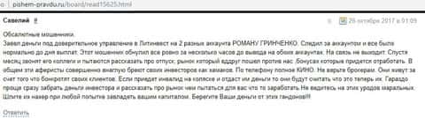 Мошенники втискиваются в доверие к клиенту и получат то что им нужно. Один клиент отдал в доверительное управление свои деньги лохоброкеру Литт Инвест и открыл 2 аккаунта. Управлением занимался трейдер-аферист Роман Гринченко. Он торговал и следил, чтобы депозит не слился. Но пришло время забирать деньги и Рома слил все подчистую. На связь он не выходил, но спустя месяц клиенту позвонили его лохо-коллеги и решили выгородить Романа. Еще и угрожали, что нужно отработать бонусы, которые жертве обмана начислили. Так что если хотите инвестировать деньги в форекс рынок и отдать мошенникам в лапы, лучше сходите в магазин и купите нуждающимся еды.