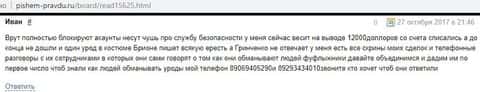 Врут и не краснеют мошенники брокерской конторы LittInvest. Человек попался на уловку и доверил свои средства аферистам. После запроса на вывод 12 000 долларов, мошенники блокировали аккаунт, ссылаясь на службу безопасности. Деньги то списали со счета, но до клиента не дошли. В схеме развода был замечен мошенник Гринченко, который и заварил эту кашу. Жертва обмана теперь хочет объединиться с такими как он и наказать злоумышленников.