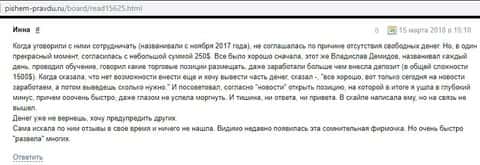Очередная девушка была кинута на деньги дилинговой конторой LittInvest. Контора очень сильно уговаривала новоиспеченного клиента вложить хотя бы 250 долларов и девушка согласилась. С ней работал аферист Владислав Демидов, звонил каждый день, обучал, и даже получилось заработать около 1500 долларов. Потом мошенник начал вымаливать еще денег, но девушка сказала что больше нет и хотела бы вывести часть прибыли. Мошенник согласился, но сказал, что есть пару очень прибыльных сделок, которые нужно срочно совершить и тогда точно выведем, только уже больше. По совету сраналитика девушка получила сигнал на новостной актив и в течении нескольких минут депозит был слит. Компания больше не отвечала ни на какие звонки, а просто морозилась. Мы еще раз предупреждаем - не ведитесь на лохотрон Литт Инвест, эта схема как мир стара!!!