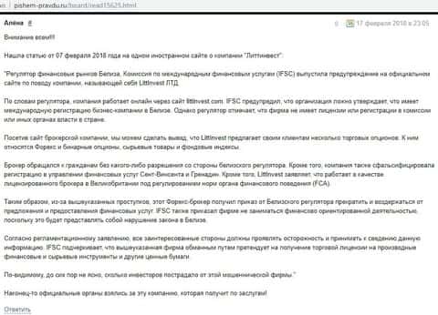 Многие интернет-ресурсы заявляют, что брокерская организация LittInvest мошенники